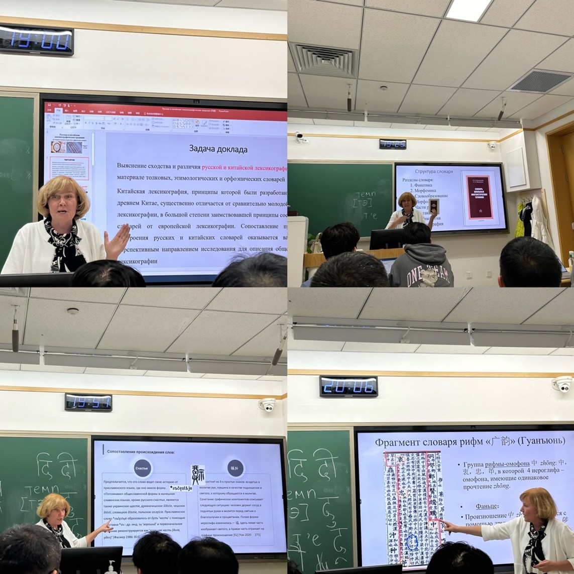 沃洛申娜副教授从中俄两国词典编纂传统谈起,介绍了俄语和汉语详解词典(толковый словарь)、词源词典(этимологический словарь)、正音词典(орфоэпический словарь)的编纂历史,并对其编纂理念的异同进行了对比。沃洛申娜副教授认为,中俄古代词典编纂的比较涉及两种语言体系在历史语境、编纂传统、方法论以及文化交融等方面的特点,体现了两种语言文化的独特性。沃洛申娜副教授指出,中俄两国具有不同的学术传统,因此比较俄汉词典的编纂原则是当代词典学研究中十分有价值的方向。