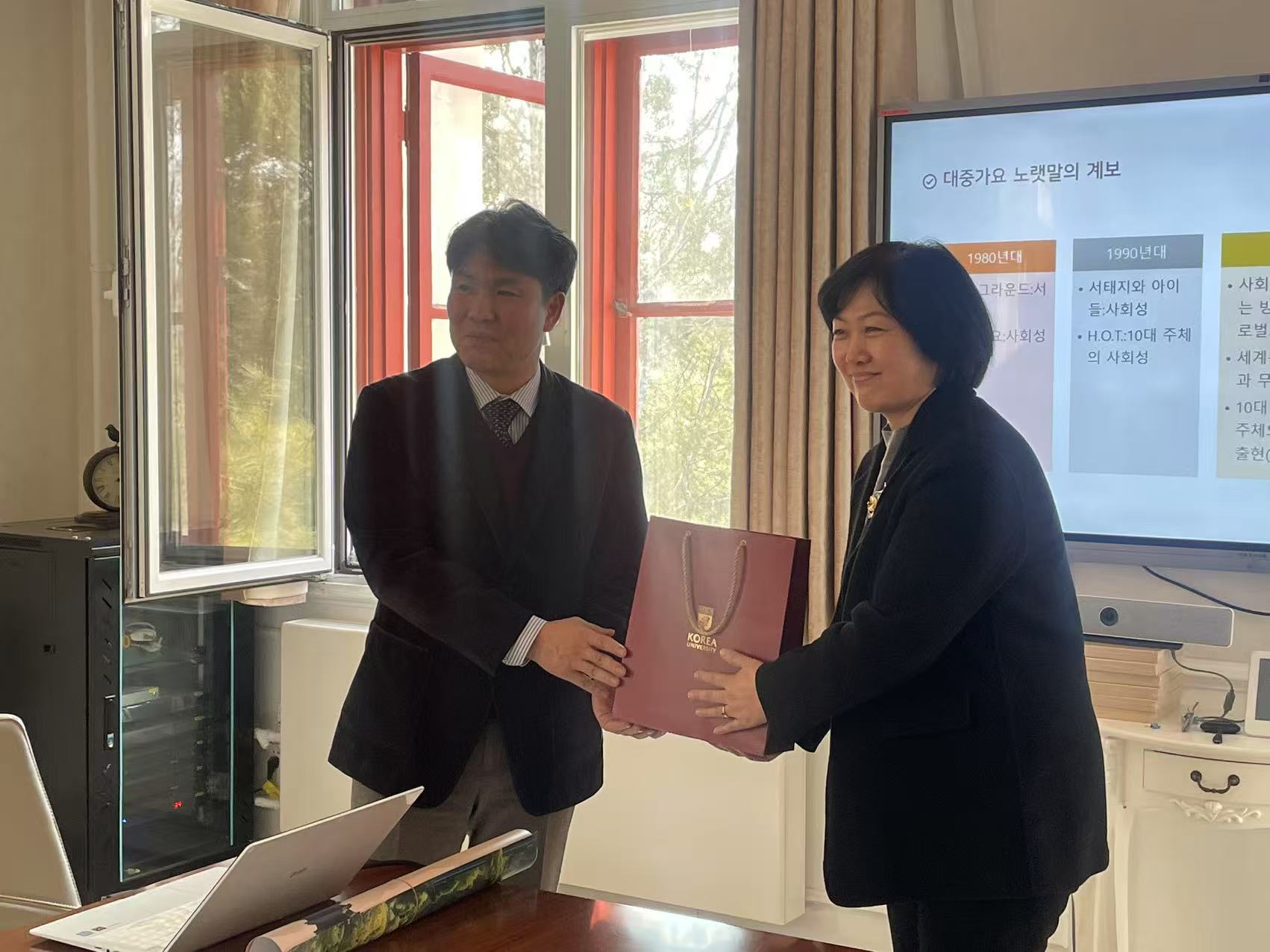 朝(韩)语系全体教师于外文楼206会议室与金钟勋教授一行进行座谈,通过座谈增进了对彼此的了解,就后续的交流与合作进行了探讨。徐晸玟老师介绍了高丽大学国际韩国语言文化研究所韩国语言文化学术传播中心自主开发的“韩国学K-MOOC线上慕课”系统,其线上课程涵盖韩国现代文学、古典文学、汉文学、韩国语教育学等多领域。