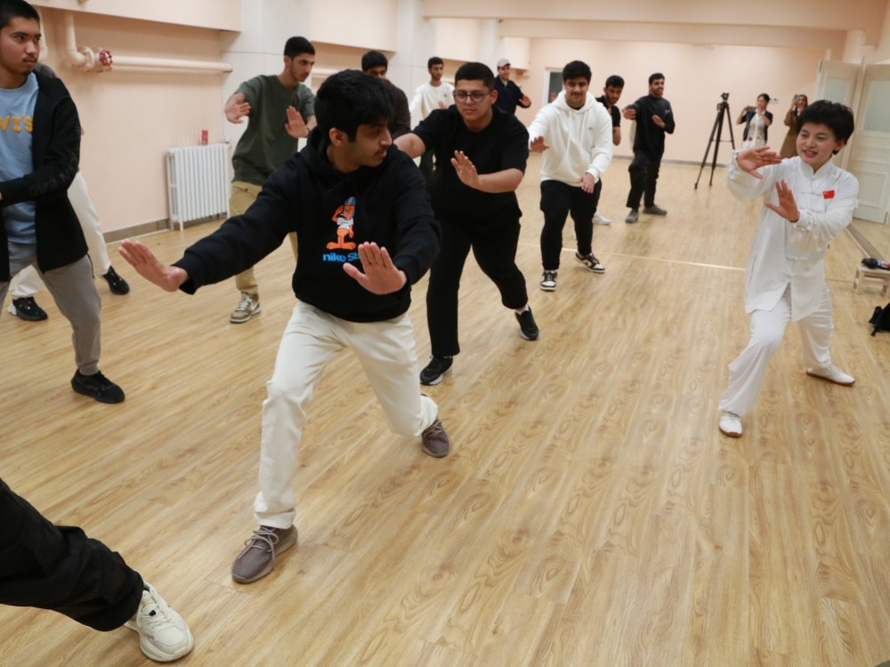 座谈部分结束后,代表团同学们与阿拉伯语系师生共同移步外文楼三层的活动教室,他们在此与太极、乒乓球老师进行短暂的交流学习,亲身感受中国的传统国粹和现代国粹运动。男同学们来到了太极教室。北京大学体教部王东敏副教授首先介绍了太极的基本动作,让大家对中国传统国粹武术有了基本的了解。接着,教授带领同学们亲自体验了太极动作,切身感受其中传承千年的中国智慧,开拓了体育运动的新视野。